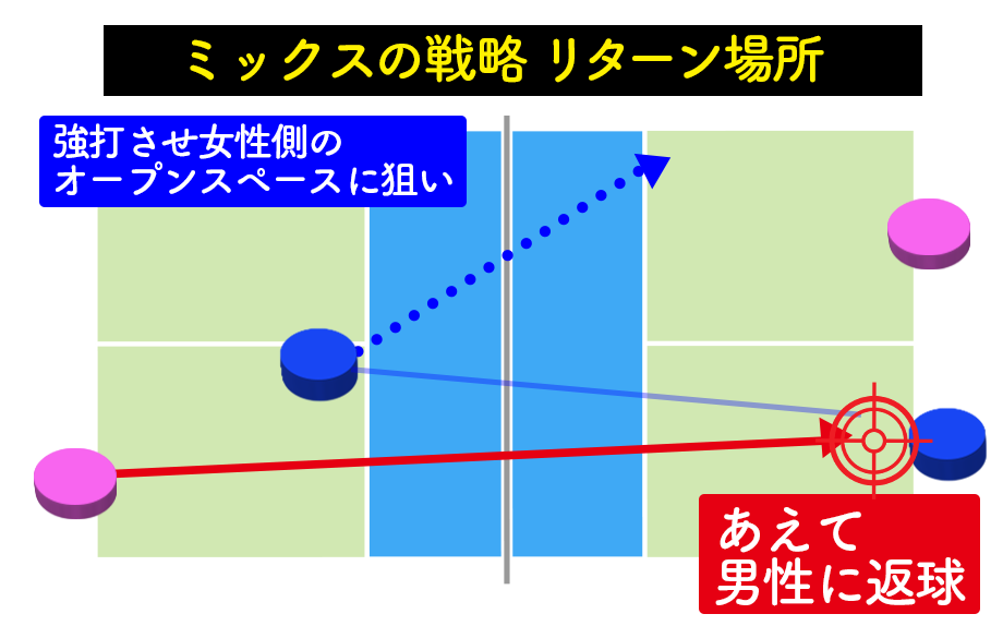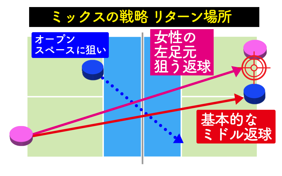 リターンを打つ場所としては、ミドルが基本なのは、ダブルスもミックスも同じです。