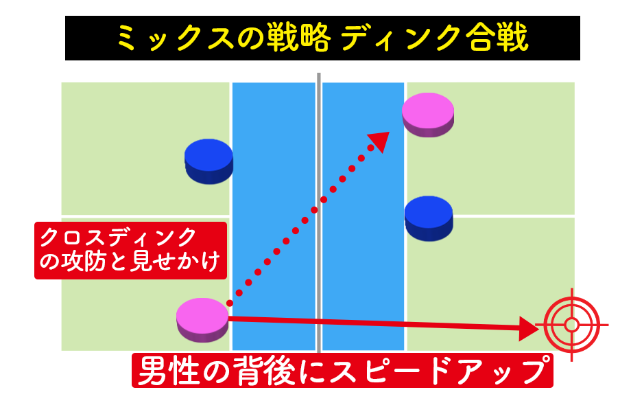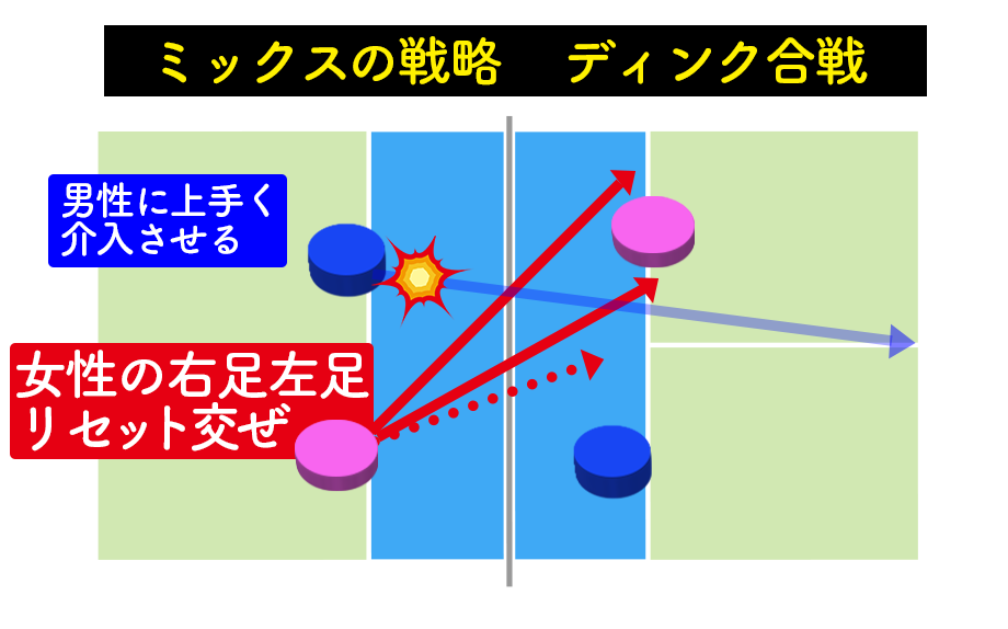 ディンク勝負でも男性が女性側のボールを奪おうとセンターラインを大きく割ってきた場合、男子の背後側にうまくリセットボールを送れば、攻め急ぐあまり簡単にミスしてくれるかもしれません。