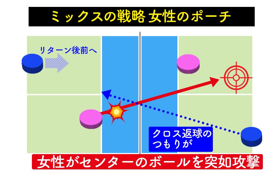 バウンドの低いリセットボールをやや女性より中央寄りに配球できれば、攻撃に集中している相手男性による強引なミスを引き出したり、パートナー同士で譲り合う「お見合い」を引き出したりできるでしょう。