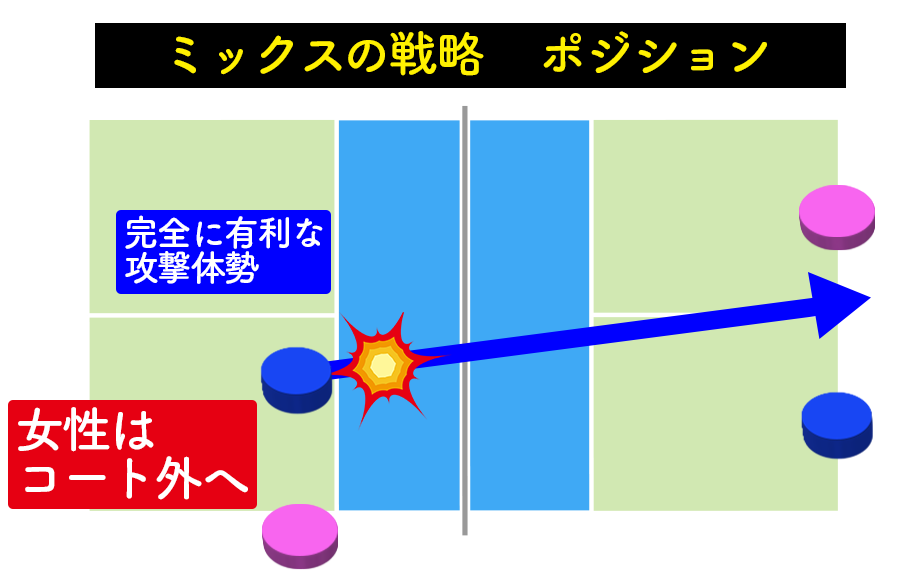 プロの男性ミックスでも、男性プレーヤーがサイドラインの外側に立ってパートナーに確実に強打させるケースはよくあります。