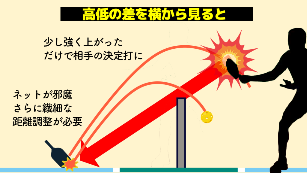 ピックルボールでは「ネットより高い位置で打てる」=「圧倒的な攻撃優位」です。