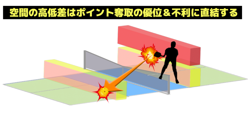 この空間内に相手のボールを引き込むことができると、まるで一段上の台から攻撃しているような状態になります。