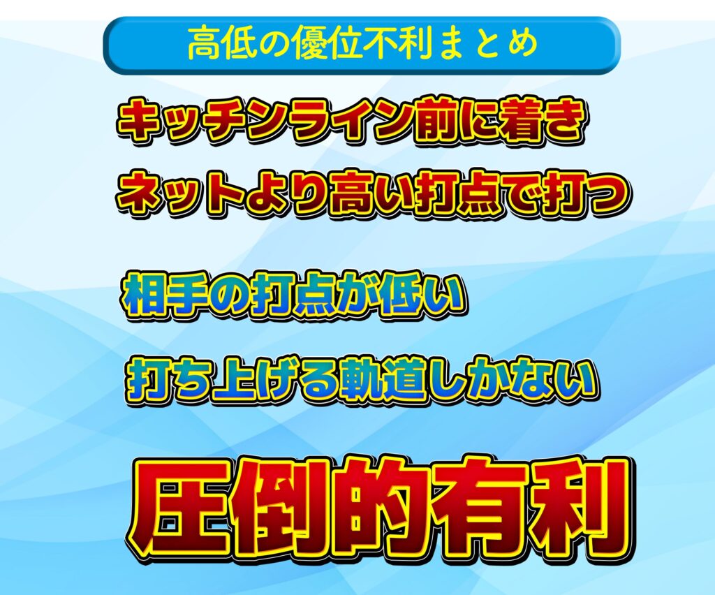 - 打点が高いと下方向に打ち込めるため、相手が防御しづらくなる