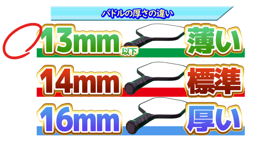 次にパドルの厚さ薄さについてですが、スピードやパワーがほしいプレーヤーは薄めを選ぶのがオススメです。