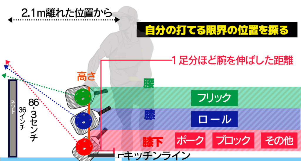 ある程度自信を持って打てる高さがあなたのフリック、ロールの打てる限界点になります。