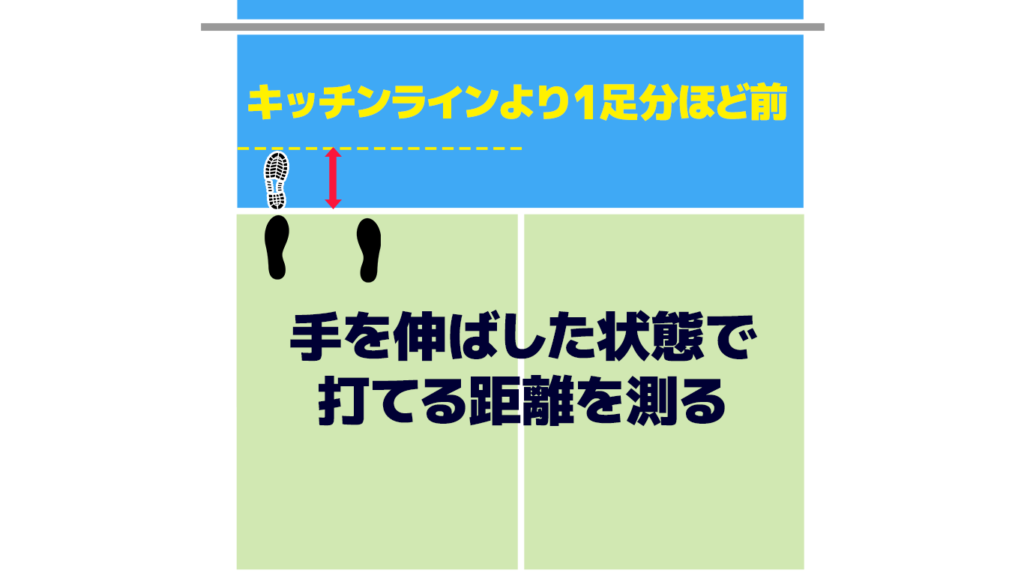 私の場合は、キッチンラインより自分のシューズ1足分ほど前。30センチ以内の地点を目安としています。