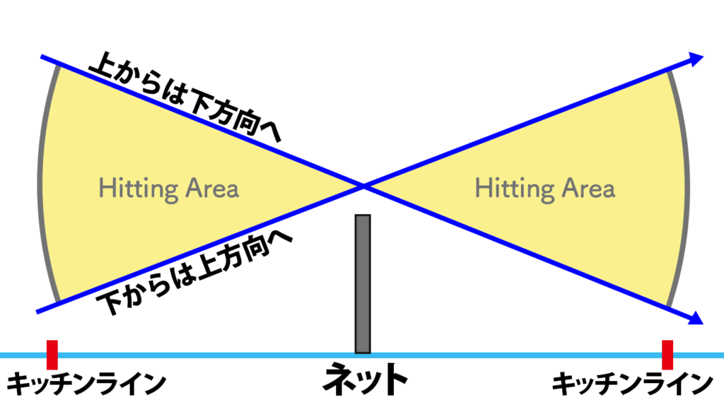 クロスに引っ張ったらボールは自分の左側、すなわちパートナーの方へ。パートナーが逆クロスに打てば、自分側へ。正面に打てば正面に返ってきますよね。