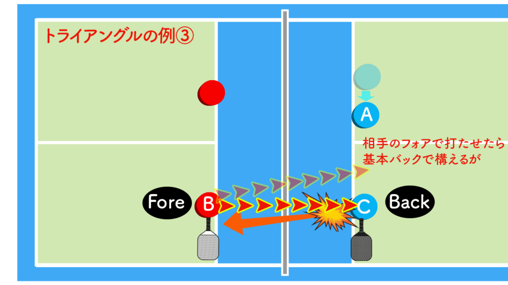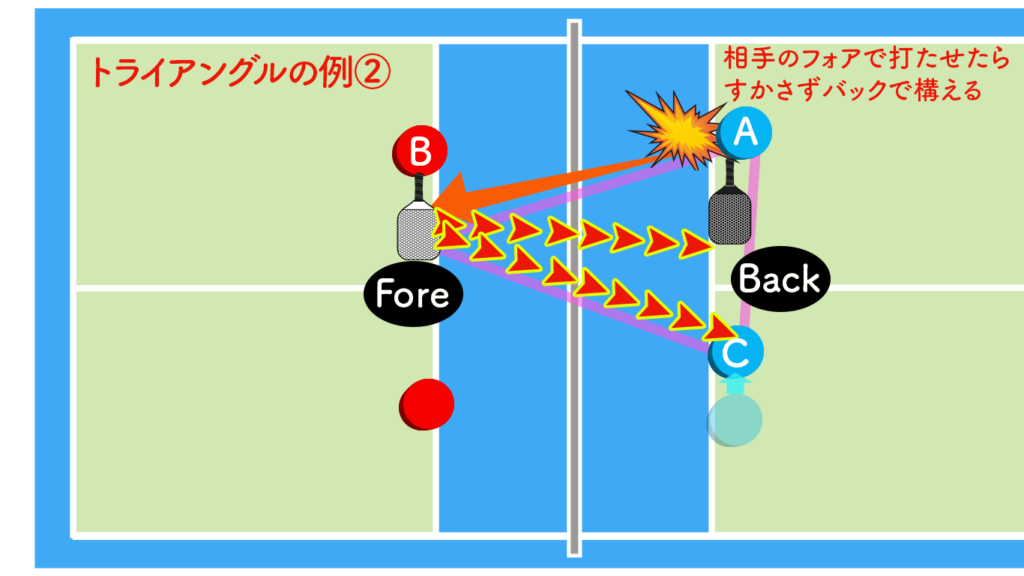 自身はバックの予測をして構えています。逆を突かれ、フォア側に逃げていくボールになると、バックで処理できる範囲は限られるため、ついセンターボールを「A」に任したいと思ってしまいます。