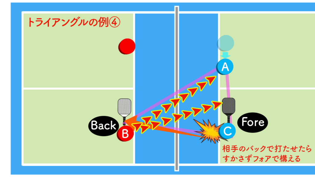 相手「B」がチキンウィングの体勢にならず、うまくフォアでパドルを立てて処理されると一転、ピンチになります。