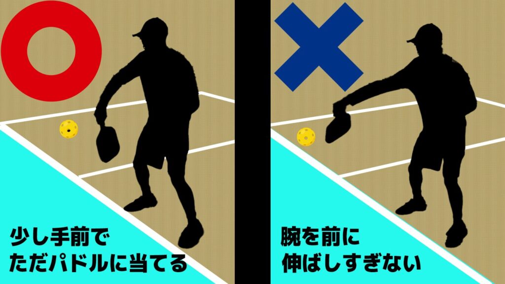 次の動画でピックルボールコーチのジョーダン・ブリオネス氏は「絶対にプッシュやパンチ、スイングをしないこと」を強調しています。