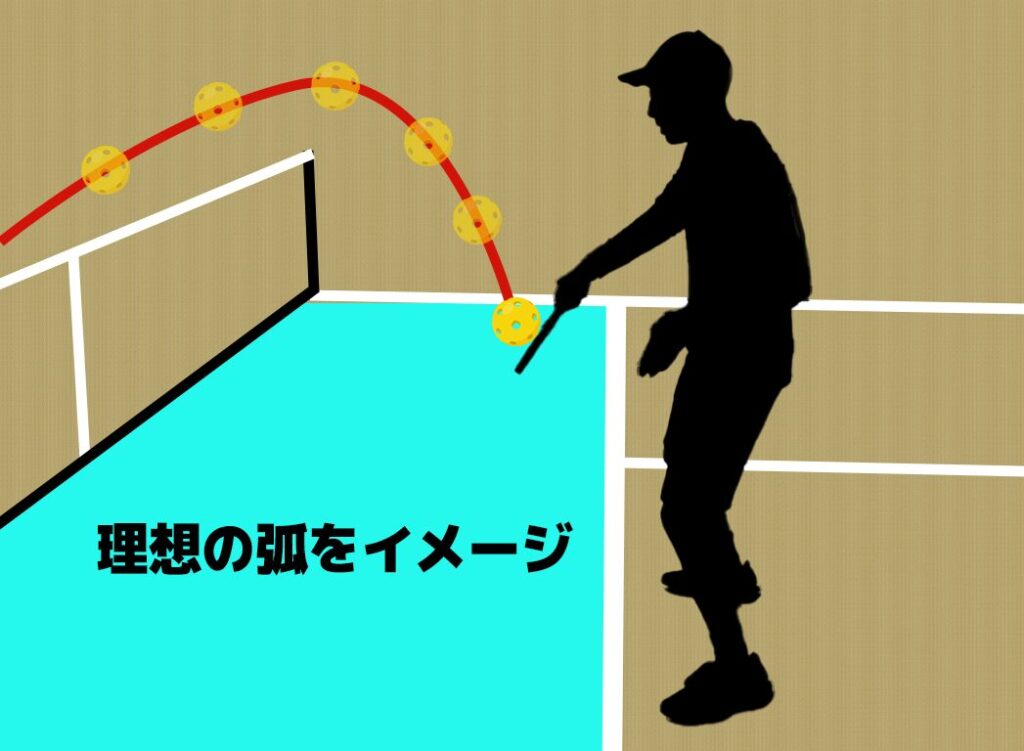 45度の角度から弧を描くようにネットを越えさせる必要があります。そうすれば、自然とボールが下がっていく軌道を描くことができるというのは、理解できますね。