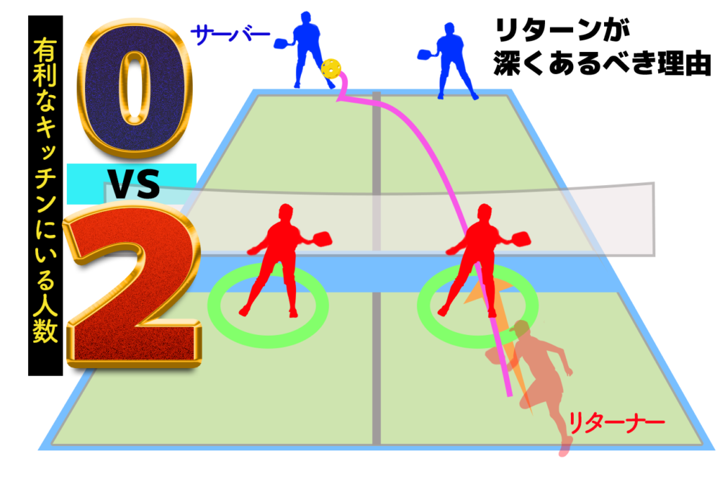 リターンサイドのパートナーは通常キッチンライン前に詰めています。リターナーが深いリターンを打ち、キッチンラインへと前進できれば、ネット前にいるプレーヤーは2人。