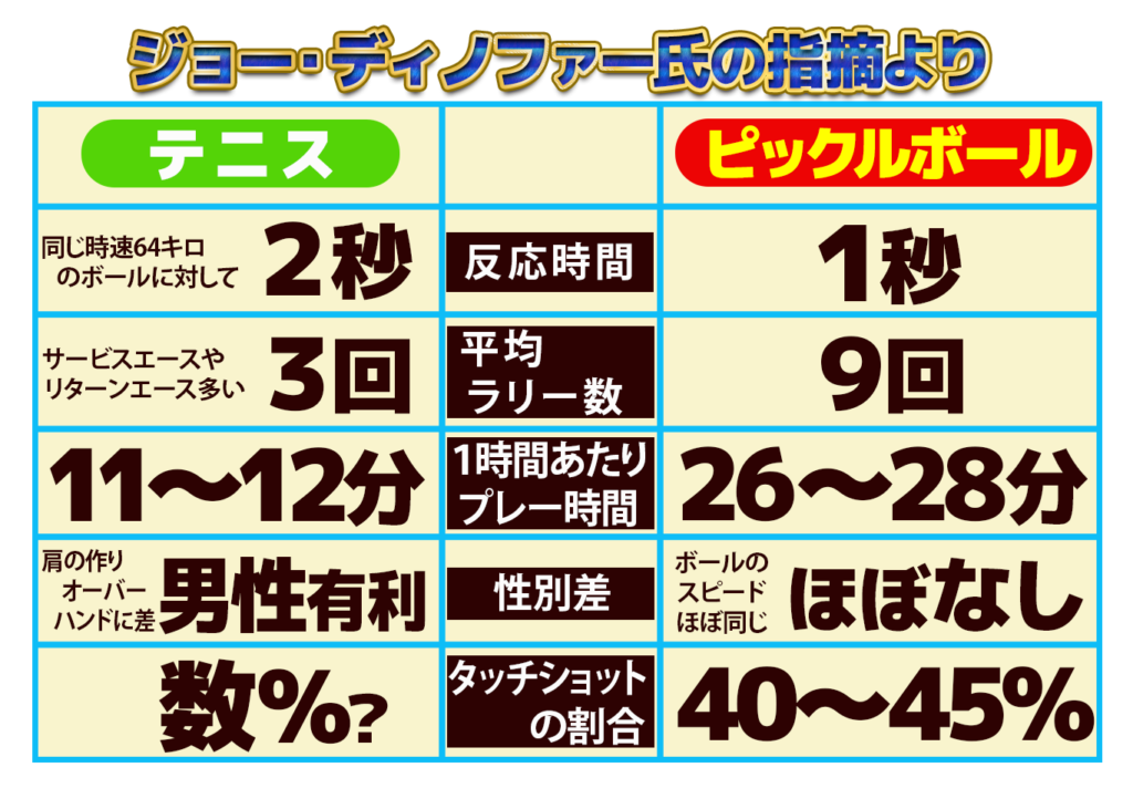 以下の図は、以前、ご紹介した有名テニスコーチ、ジョー・ディノファー氏の指摘による「テニスとピックルボールの主な違い」です。