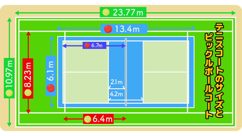 テニスコートの縦幅は23.77メートル、それに対してピックルボールコートは13.4メートルと距離は約半分。