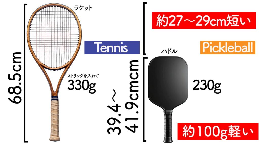 ピックルボールのパドルはテニスのラケットより、長さが約27~29cm短くなります。