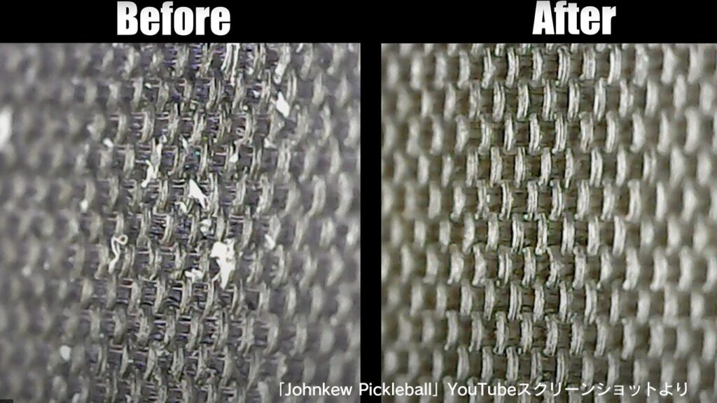 次の「Johnkew Pickleball」動画では、パドル消しゴム使用前と使用後のパドル表面を顕微鏡で見た貴重な画像が見られます。
